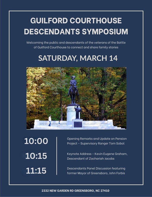 Join Guilford Courthouse National Military Park for our first-ever Descendants Symposium! The symposium will kick off with a summary of the accomplishments of the park’s dedicated citizen archivists, who have transcribed all pension files of identified veterans of the Battle of Guilford Courthouse. Kevin Eugene Graham will deliver the keynote address on his ancestor, Zachariah Jacobs Holmes. Descendants will then discuss how they have researched and uncovered the stories of their Patriot ancestors and what those stories mean to them today. The event will conclude with an audience Q&A session.